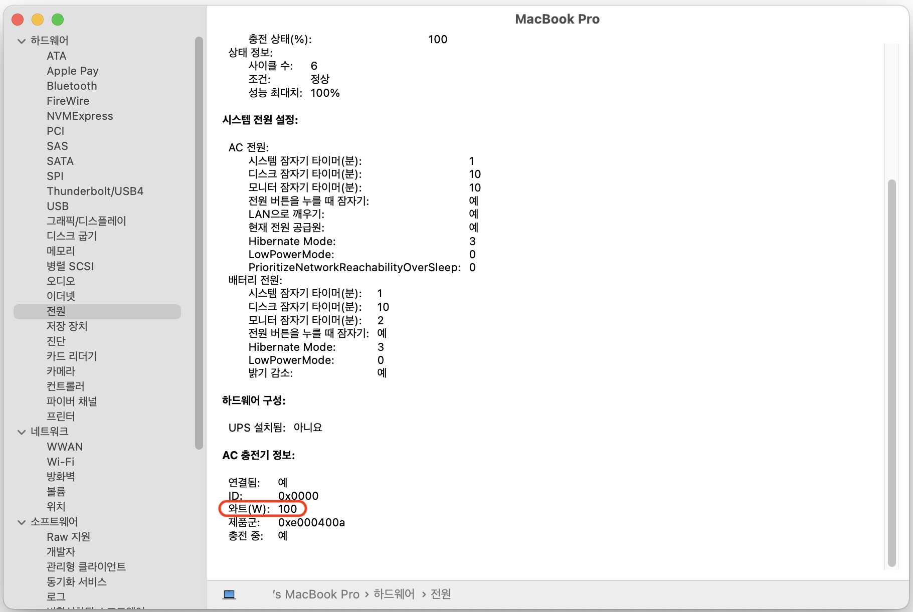 맥북에서도 정상적으로 100W로 인식이 된다. 그러므로 '2. PD 최대 충전 와트인 100W 이어야한다.' 충족!